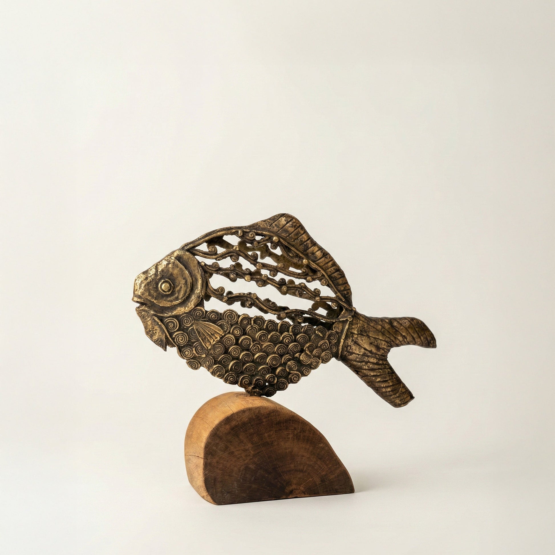 Created by Rahul Dey, a rising voice from the Kolkata art circuit, this piece reinterprets Dhokra through a contemporary lens—lighter in spirit, intentional in form, and grounded in an eco-conscious approach to metalwork. The organic perforations and rhythmic surface details echo movement, breath, and continuity, reminding us that craft is not static; it evolves while staying rooted.