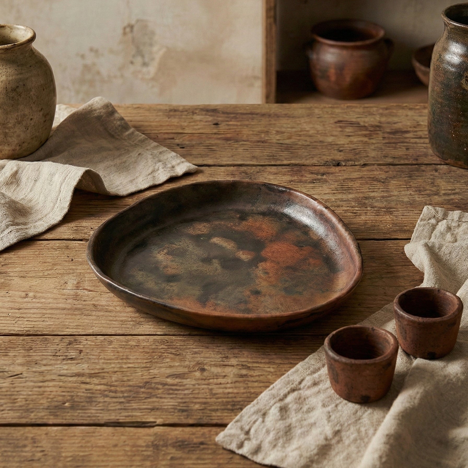 Handcrafted in the forested Sung Valley of Meghalaya, each plate is shaped by women artisans using homegrown wheels and handmade tools. The region’s distinctive black clay is formed slowly, then burnished with smooth serpentine stone, revealing a surface layered with earthy browns, charcoal tones, and natural variations left by fire and hand.